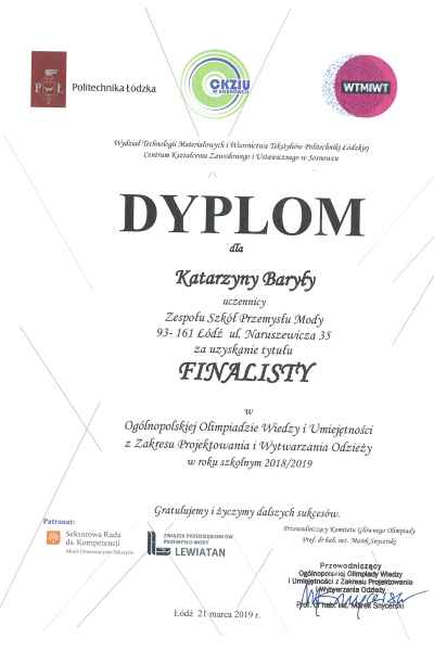 W tym roku finalistkami olimpiady z naszej szkoły zostały: z klasy 2a Natalia Frątczak i Ola Owidzka , a z klasy 3a Kasia Baryła i Paulina Stępień. Nagrodą dla finalistek jest zwolnienie z pisemnej części egzaminu potwierdzającego kwalifikacje zawodowe oraz dyplom, który otrzymały z rąk prof. Marka Snycerskiego.