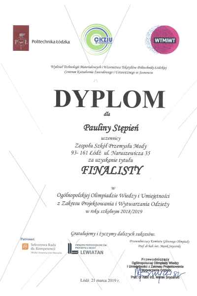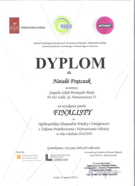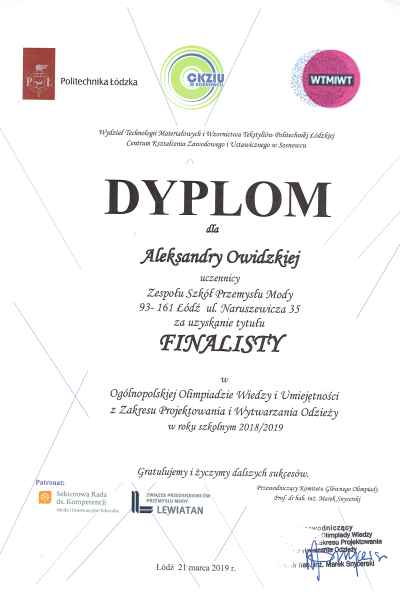 W pierwszy dzień kalendarzowej wiosny uczennice klas odzieżowych 2a i 3a po raz szósty uczestniczyły w finale Ogólnopolskiej Olimpiady Wiedzy i Umiejętności z Zakresu Projektowania i Wytwarzania Odzieży organizowanej przez Politechnikę Łódzką.