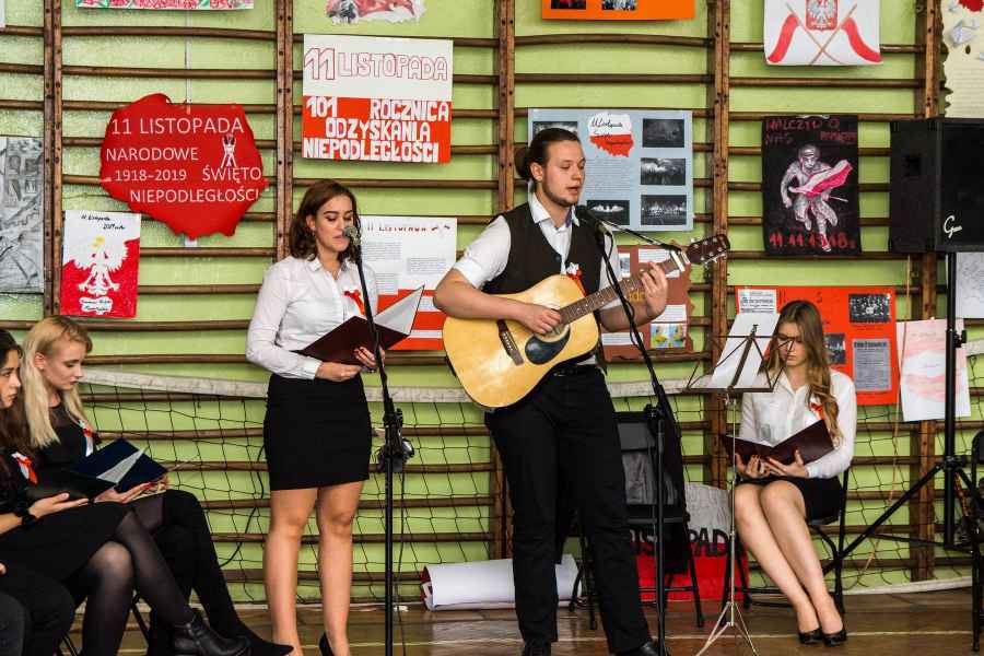 Program muzyczny został zrealizowany przez Filipa Furmańczyka ucznia klasy IVF ( śpiew, gitara) przy współudziale Natalii Holonko - „Moja Litania”, Zuzanny Makarewicz uczennicy klasy IA - „Nie pytaj o Polskę” ,Mai Kasprzak - „Czas Honoru - Tchnienie wolności” (śpiew, flet) oraz chóru uczennic z klas I i II – „Szara Piechota”. II gitara Justyna Gos.