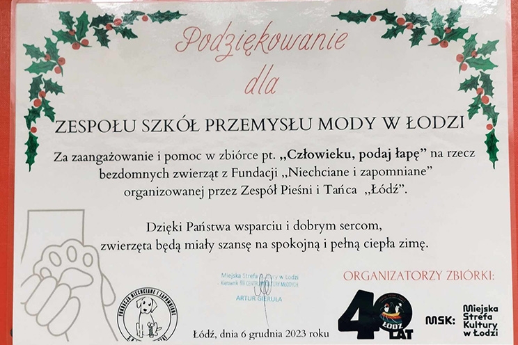 W okresie przedświątecznym nasza szkoła przystąpiła do akcji zorganizowanej przez Zespół Pieśni i Tańca "Łódź" na rzecz Fundacji Niechciane i Zapomniane „Człowieku, podaj łapę”.